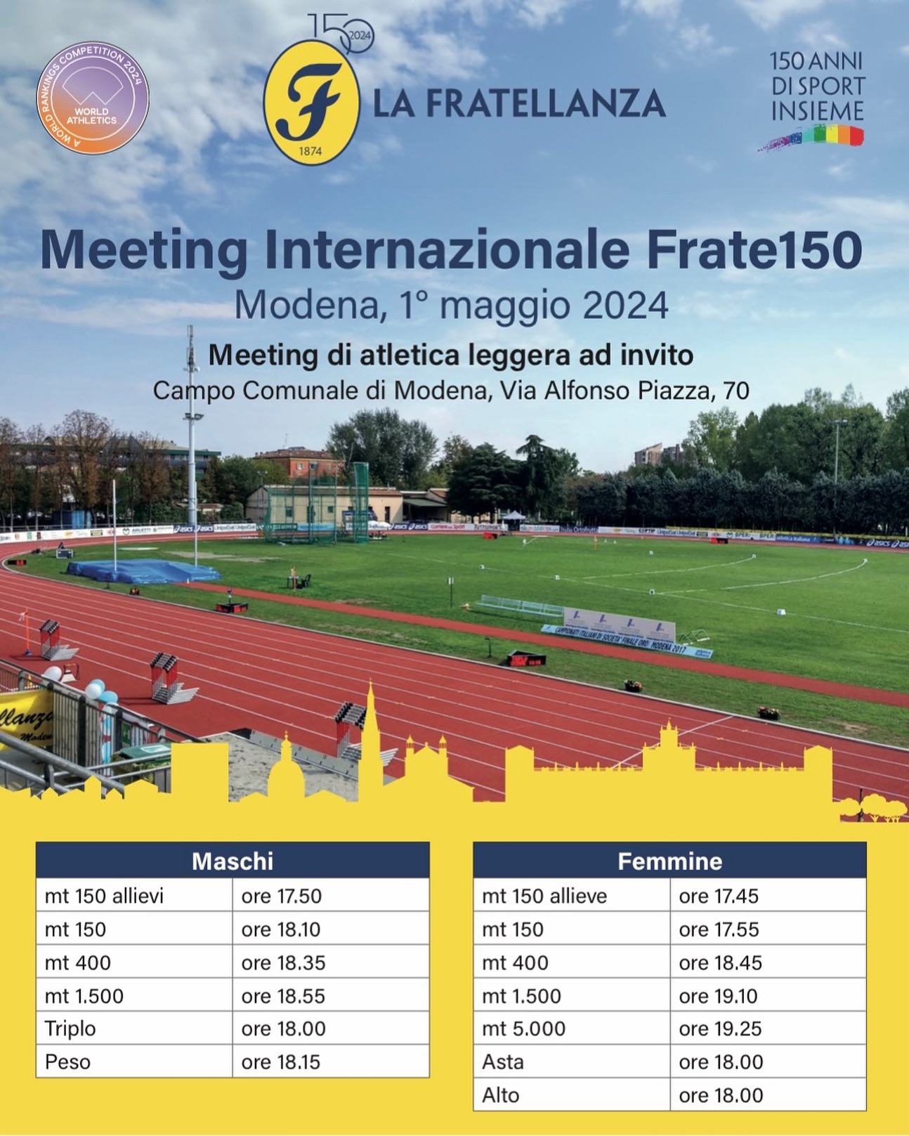 In occasione dei 150 anni dalla fondazione della Fratellanza 1874 Modena, la società ha organizzato un meeting di atletica di alto livello che si svolgerà il 1° maggio.Saranno in gara atleti di ottimo livello fra i quali campioni olimpici ed europei e sul podio ai Campionati Mondiali.